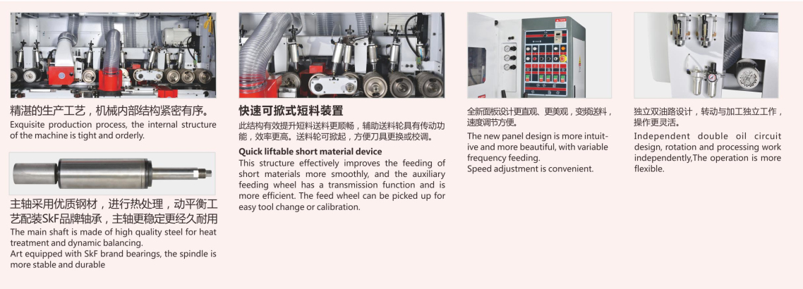 佛山重型四軸四面刨,佛山雙面刨鋸機(jī),木工機(jī)械設(shè)備,廣東優(yōu)質(zhì)廠家木工加工機(jī)械,廣東雙面刨鋸機(jī) 全新面板設(shè)計(jì)更直觀,更美觀,變頻送料,速度調(diào)節(jié)方便。快速可掀式短料裝置,獨(dú)立雙油路設(shè)計(jì),轉(zhuǎn)動與加工獨(dú)立工作操作更靈活。